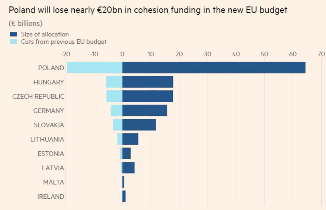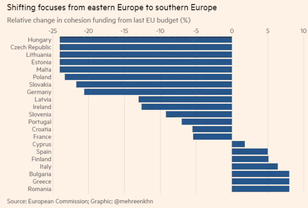 В новом долгосрочном бюджете ЕС изменяется структура расходов направленных на выравнивание экономической ситуации в странах евросодружества. Вся программа в течении периода 2021-2027 года сокращается на 10%. Кроме того более 30 млрд. евро перебрасываются с финансирования стран восточной европы на финансирование стран европы южной. На следующих картинках представлена информация какие страны больше всего теряют и приобретают от перераспределения европейского бюджета: