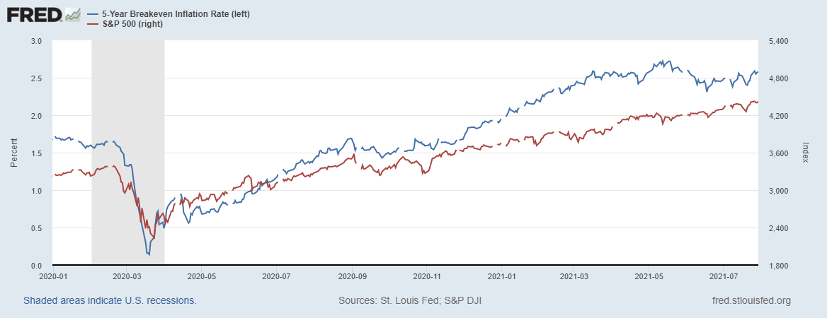 Красная линия – котировки широкого рынка, фондовый рынок США целиком и полностью детерминирован рефляционными ожиданиями, и восстановление котировок не синхронизируется с ожидаемой инфляцией.