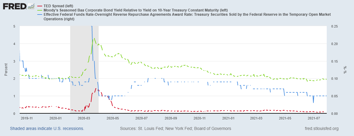 Синяя линия – самый главный, на мой взгляд, дифференциал на рынке ставок, это разница между ставкой по избыточным резервам и рыночными ставками, показатель остается на докризисных минимумах, сигнализируя о мягких кредитных условиях, т.е. рыночная ставка против учетной остается низкой.