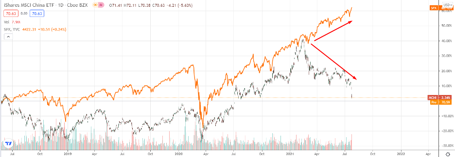 Причина падения, безусловно, не затрагивает акции США, потому что Китай падает из-за выросших политических рисков и внутренней денежно-кредитной политики. С начала года китайский ЦБ сдувал пузырь в активах за счет повышения ставки и ужесточения ДКП, а вдобавок государство штрафовало крупные публичные компании и делала ряд других неблагоприятных для инвестклимата вещей (например, запретила приложение Didi, обрушив акции на 50%). В этот понедельник Китайская партия, по сути, уничтожила акционеров сектора онлайн-образования за один день — это достаточно серьезный факт, побудивший некоторых инвесторов (возможно даже внутренних) сокращать объемы риска на Китай, из-за чего распродажи в пн-вт ускорились.