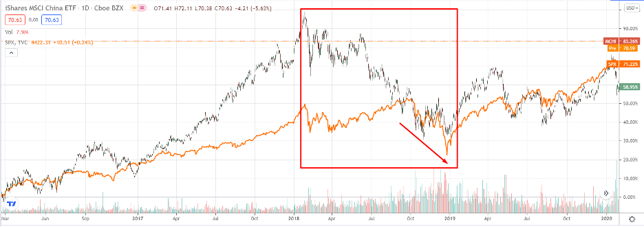 Китайские акции скорректировались примерно на 30%, при этом большую часть коррекции США не реагировали, а присоединились уже в конце, упав на 15% с сентября по декабрь 2018-го (падение длилось 3 месяца).