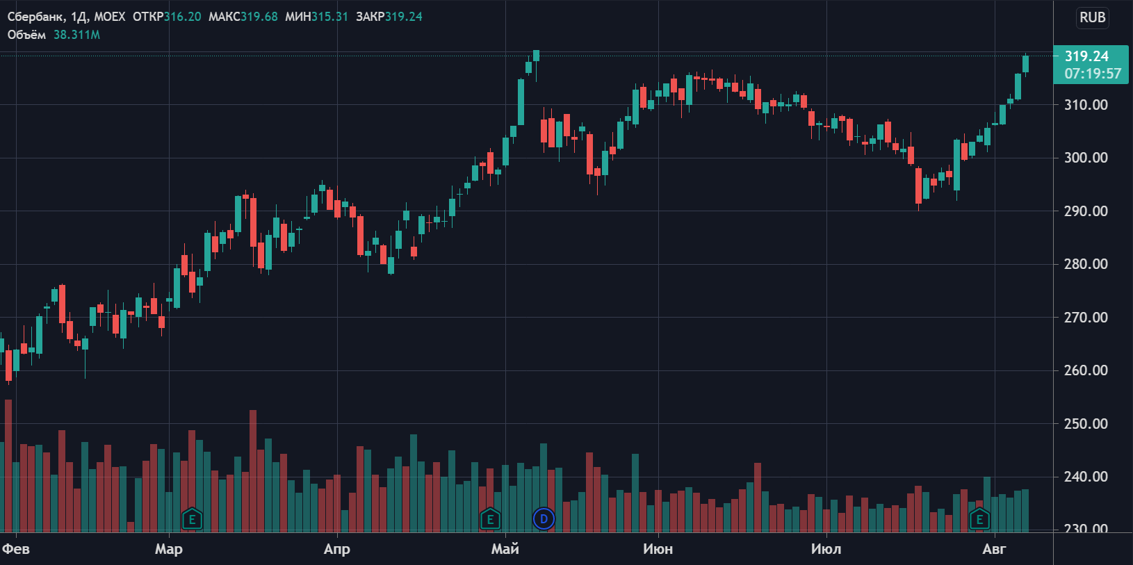 Компания демонстрирует впечатляющие финансовые показатели и может получить 1 трлн. рублей чистой прибыли по итогам года. Акции Сбербанка в последнее время выглядят гораздо сильнее российского рынка в целом и сейчас торгуются вблизи уровня 320 рублей.