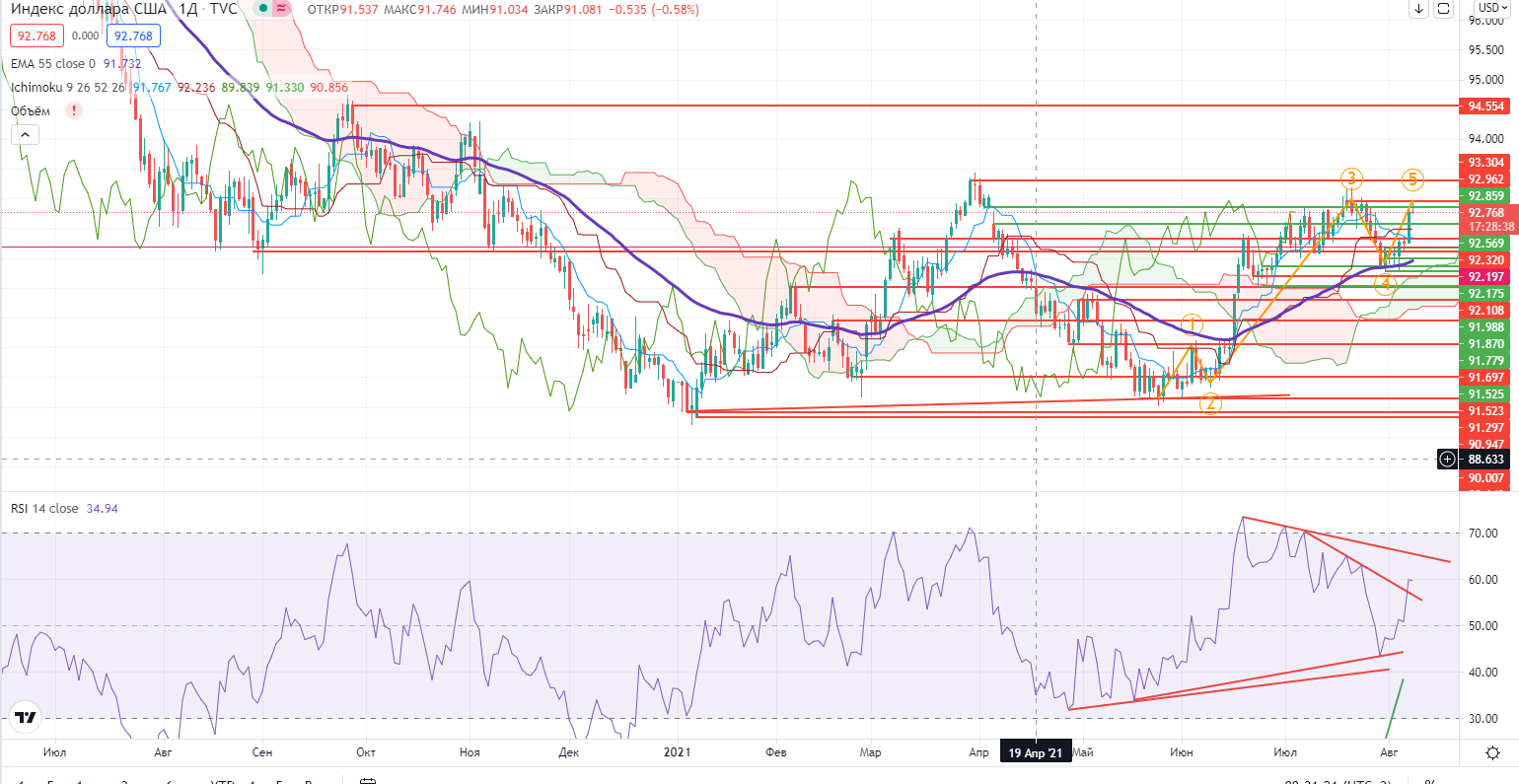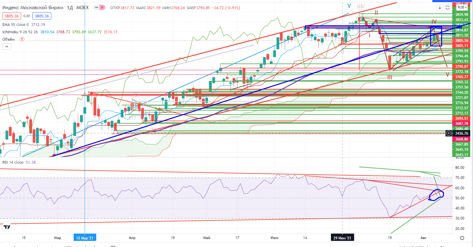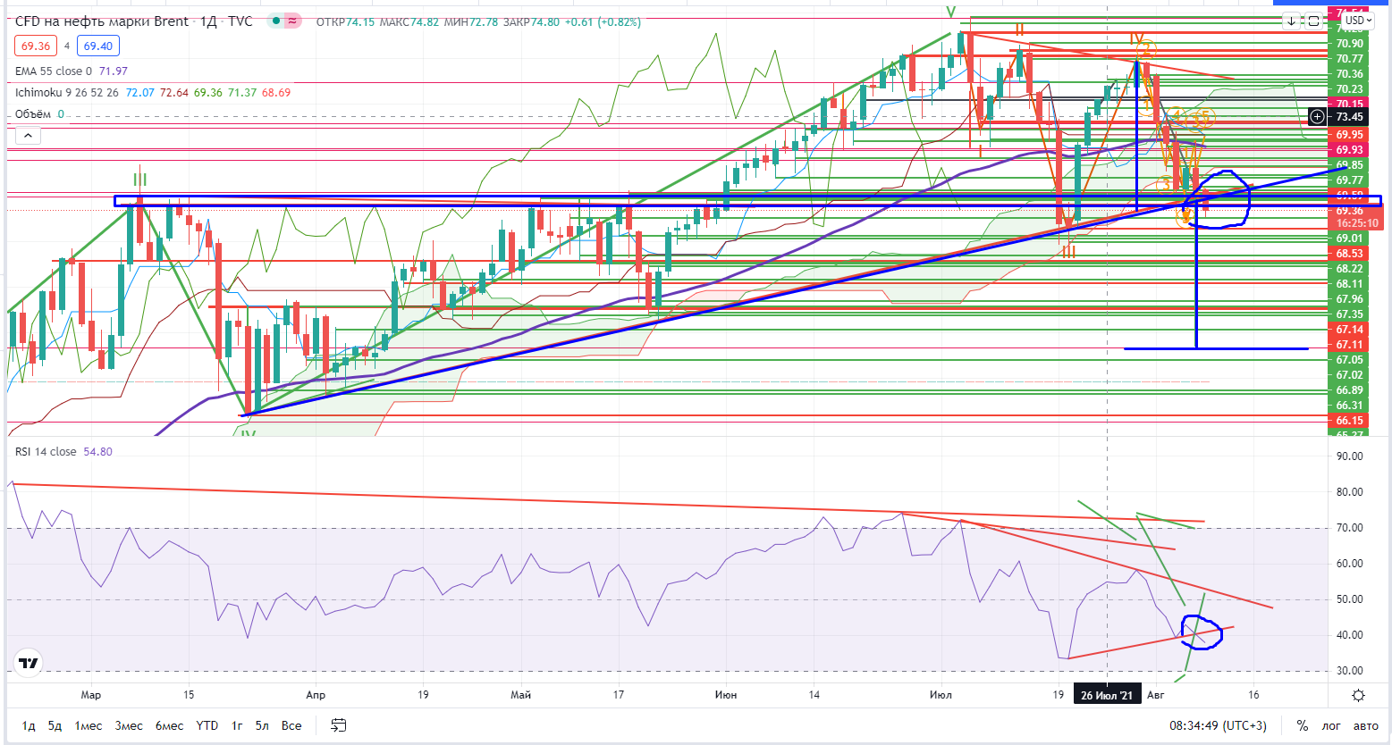 Появилась новая версия в нефти на дневном графике. Возможно это был просто клин. По поведению очень похоже.Была протестирована зона поддержки $69,55-69,95 (там же проходит и тренд). На утро идет пробой этих уровней и RSI пробивает тренд. Проход ниже тренда и $69,5- откроет путь к продолжению падения. Есть еще некий уровень $68,6, который может стать некой поддержкой, но если и его пройдут, то нефть может свалиться и дальше (мишень от пробоя тренда примерно $62,68+-), а вот там возможно и надо будет рассматривать торговлю и от лонга тоже (https://www.finam.ru/analysis/marketnews/neft-v-globalnom-plane-eshe-nedopadala-20210805-09400/) .