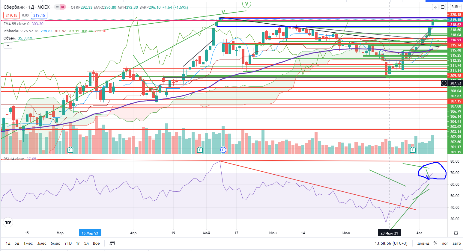 В Сбере на днях происходит мегарост, Закрылся в зоне турбулентности 315,5-320,2, RSI есть еще свобода хода вверх. ТА не работает, бумага упущена. Надо ждать хоть намека на коррекцию. Тем кто в лонге-терпите прибыль!!! Стоп можно разместить под 315- ПО ЗАКРЫТИЮ ДНЯ! Спекулятивно пока где брать непонятно, на часах из за бурного роста нет пока четких уровней для стопов.