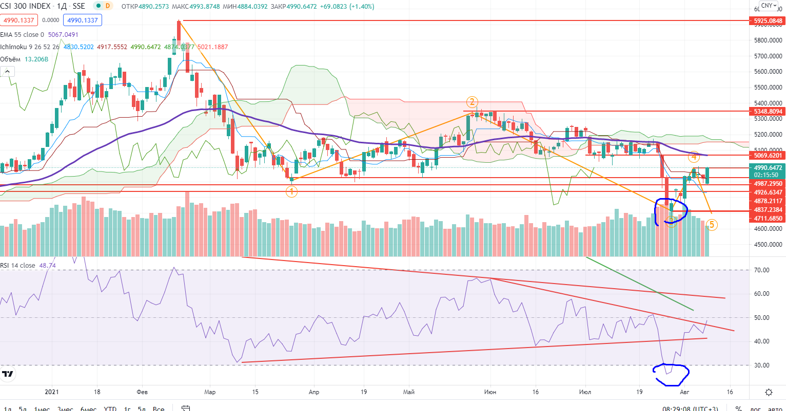 Снова начались проблемы с Китаем, от него стало очень многое зависеть, по крайней мере по открытию рынка, и нужно снова учитывать его поведение. Напомню ( https://www.finam.ru/analysis/marketnews/neftyanka-slaba-20210802-09300/) появился новый негатив, в CSI на днях не было дивергенции на крайнем импульсе вниз, так что повтор минимума очень возможен…Но локально растет..