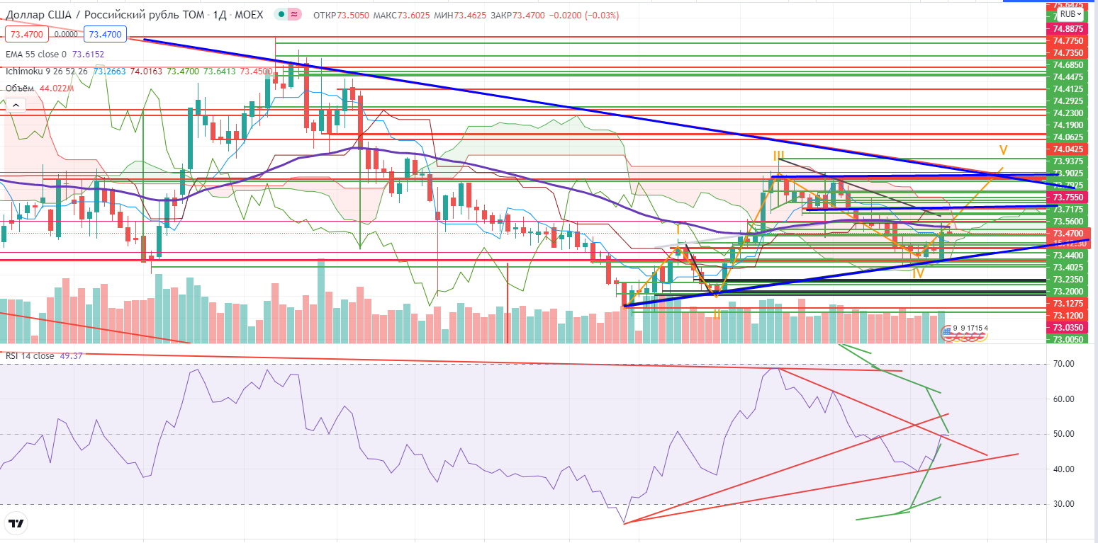 Пара USDRUB на фоне роста DXY и падения нефти перешла в локальный рост. Возможно она дорастет до локального сопротивления 74,07-, а может даже и выше, вплоть до тройной (в этом случае) вершины 74,7. Часть лонга собираюсь прикрывать на этих уровнях. А вот проход выше 74,7 может совпасть с проходом и тренда, и в таком случае рост может превратиться в глобальный, о чем я много раз предупреждал… Но об этом пока рано говорить. Продолжаю держать спекулятивный лонг со стопом 72,7 по окончанию дня!
