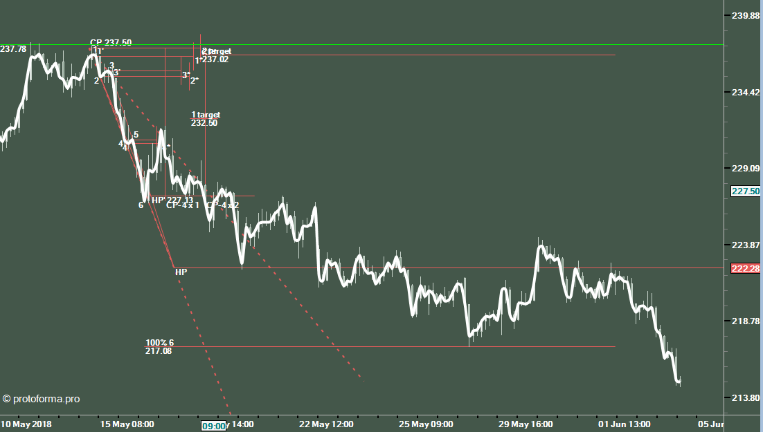 Становиться по даун тренду можно было при повторном пробое уровня т.6. Плюс в моём случае в качестве подтверждения были получены сценарии и протоформы, рассчитанные Экспертом ТА: