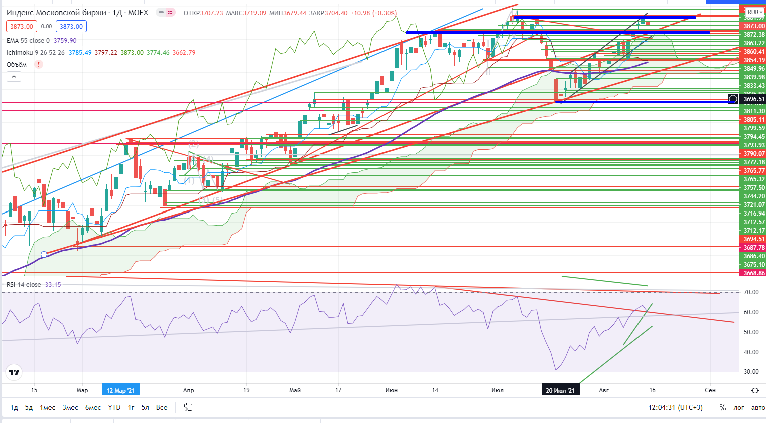 Закончилась неделя, так вот на на недельном графике индекса ММВБ пока «двойной хай» с дивергенцией, а с учетом нахождения в волне V, рост может прекратиться.