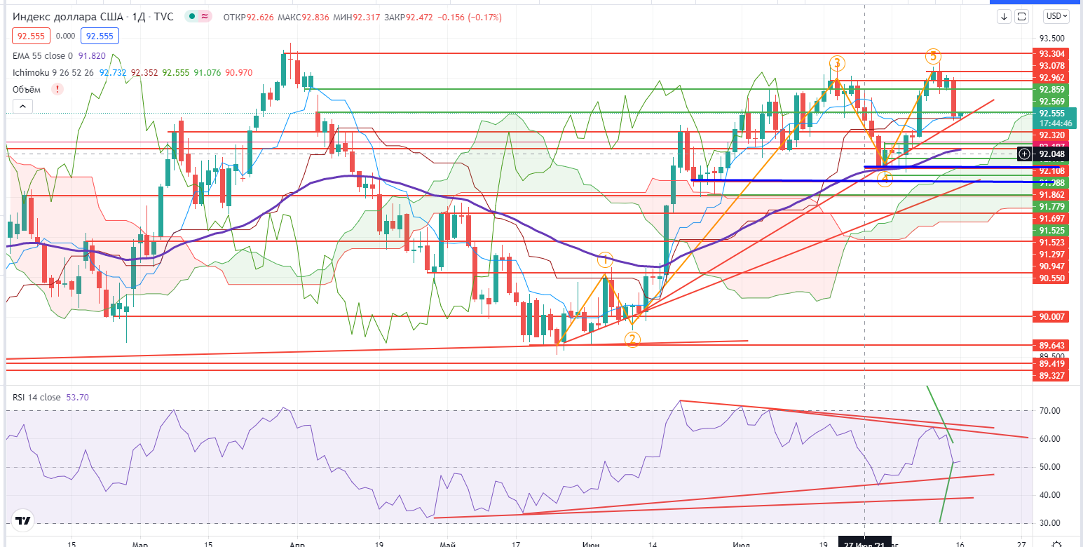 На этом впрочем однозначность заканчивается. После пятничных данных по безработице индекс DXY пошел падать, и очень сильно. Возможно 5-ти волновой рост и сломан, но пока не пройдена реперная зона 91,7-91,88 говорить об этом в полной мере рано.