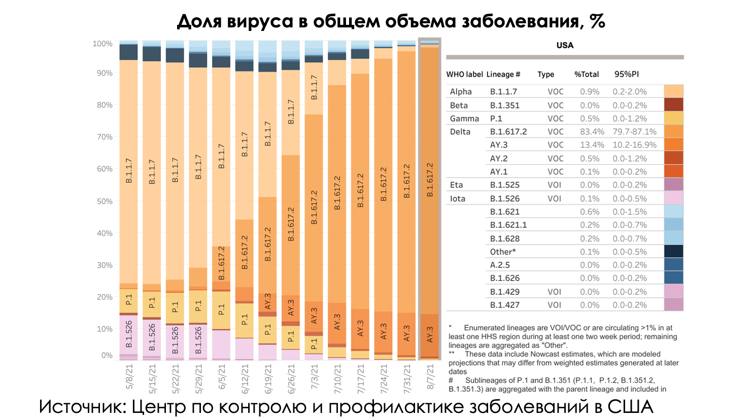 Сейчас в США идет новая волна заражений, причиной которой является стремительное распространение нового штамма вируса – Delta-штамма. По данным Центра по контролю и профилактике заболеваний в США, около 97% новых случаев приходится на Delta-штамм.