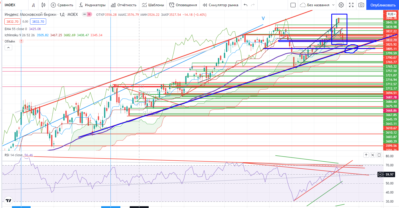 Индекс ММВБ на днях рисует очень неоднозначную картину. Неоднозначность заключается в проходе предыдущего исторического хая гэпом. Возможно(!), что зона предыдущего гэпа 3826-3832 и будет являться некоей поддержкой (возможно просто психологической), но если ее пройдут, то можно ждать продолжение снижения вплоть до 3780+- (гор.ур. + тренд). Каждый торгует сам, у каждого разные стратегии, но спекулятивно никуда оставаться не нужно!!!