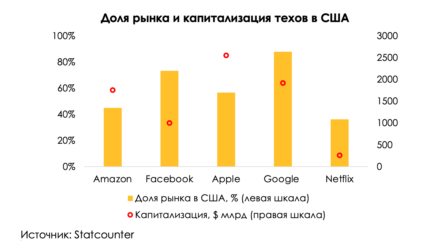 Размышляя о «королях» диджитал среды, вспоминаешь акроним FAANG, производный от пяти крупных технологических компаний в США: Facebook (FB), Amazon (AMZN), Apple (AAPL), Netflix(NFLX) и Alphabet, он же Google (GOOG). Компании не только являются самыми крупными по капитализации техами, но и занимают значительную долю своих рынков (более 40%, исключение Netflix).