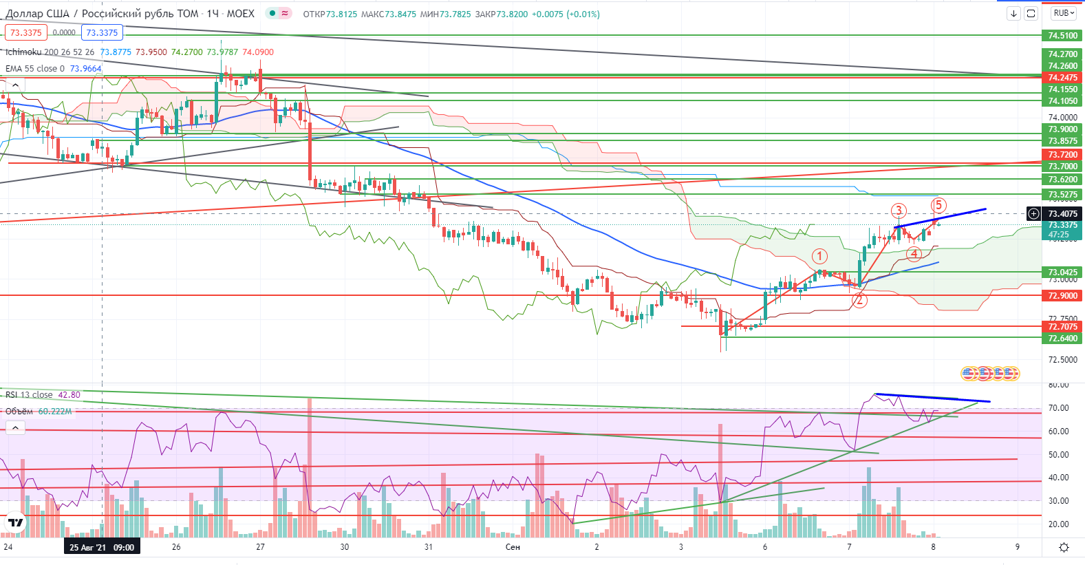 USDRUB на днях нарисовал разворот вверх, до куда дорастет пока не понятно, возможно даже до 73,7± (горизонтальный уровень + тренд). На часах правда появилась дивергенция на крайнем хаю, но можно откат надо выкупать, рекомендуемая зона 73,05 со стопом 72,98- (чтобы не круглое число).