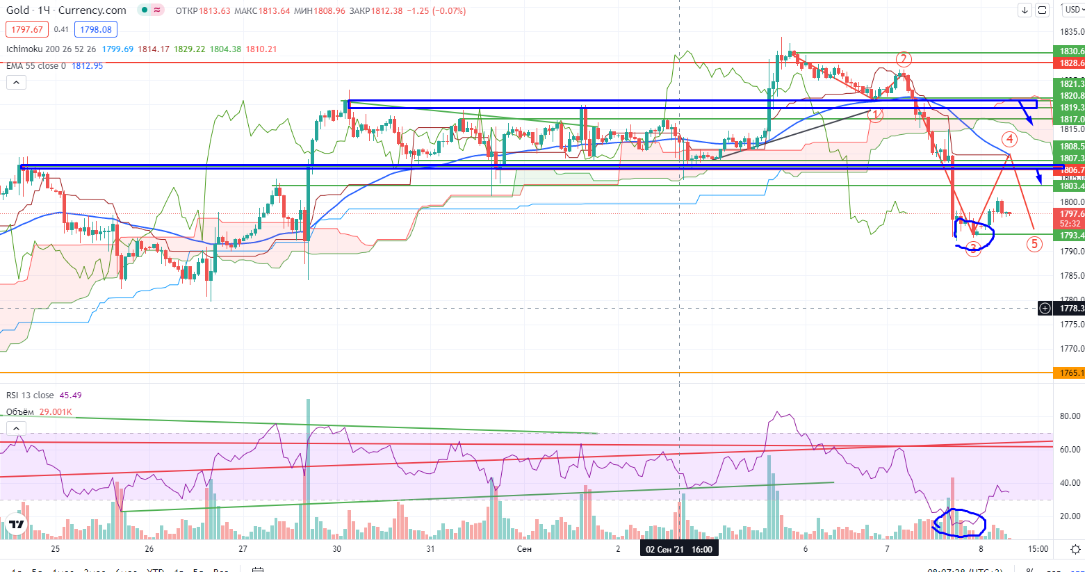 Золото не взяло уровень сопротивления $1828 на днях, и более того, нарисовало разворотную формацию вниз, которая по идее не требует подтверждения. GOLD на часах находится сейчас только в 3-ей волне падения (нет дивергенции на лоу), отскок=продавать, рекомендуемые зоны 1806-1809 со стопом 1813+ и 1819-1821 со стопом 1825+