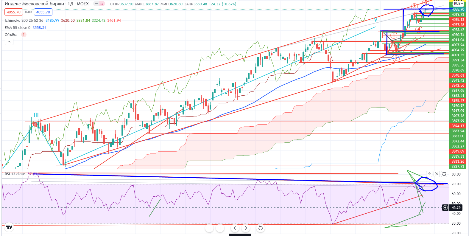 Индекс ММВБ на днях пока чувствует себя не совсем уверенно, и пока RSI под трендом рынок может оставаться неоднородным. Рисуется додж свеча раздумья), причем на хаю и с дивергенцией. Рынок крайне неоднороден, как и сырье (все таки наш рынок в основном сырьевой-это надо признать). Пока однородность не восстановиться, торговать нужно только локальные идеи. Но и в локальных бумагах явный перегрев…Кстати индекс ММВБ вырос достиг мишени от пробоя канала 6954… Вроде все хорошо, но когда все хорошо надо задуматься!!!