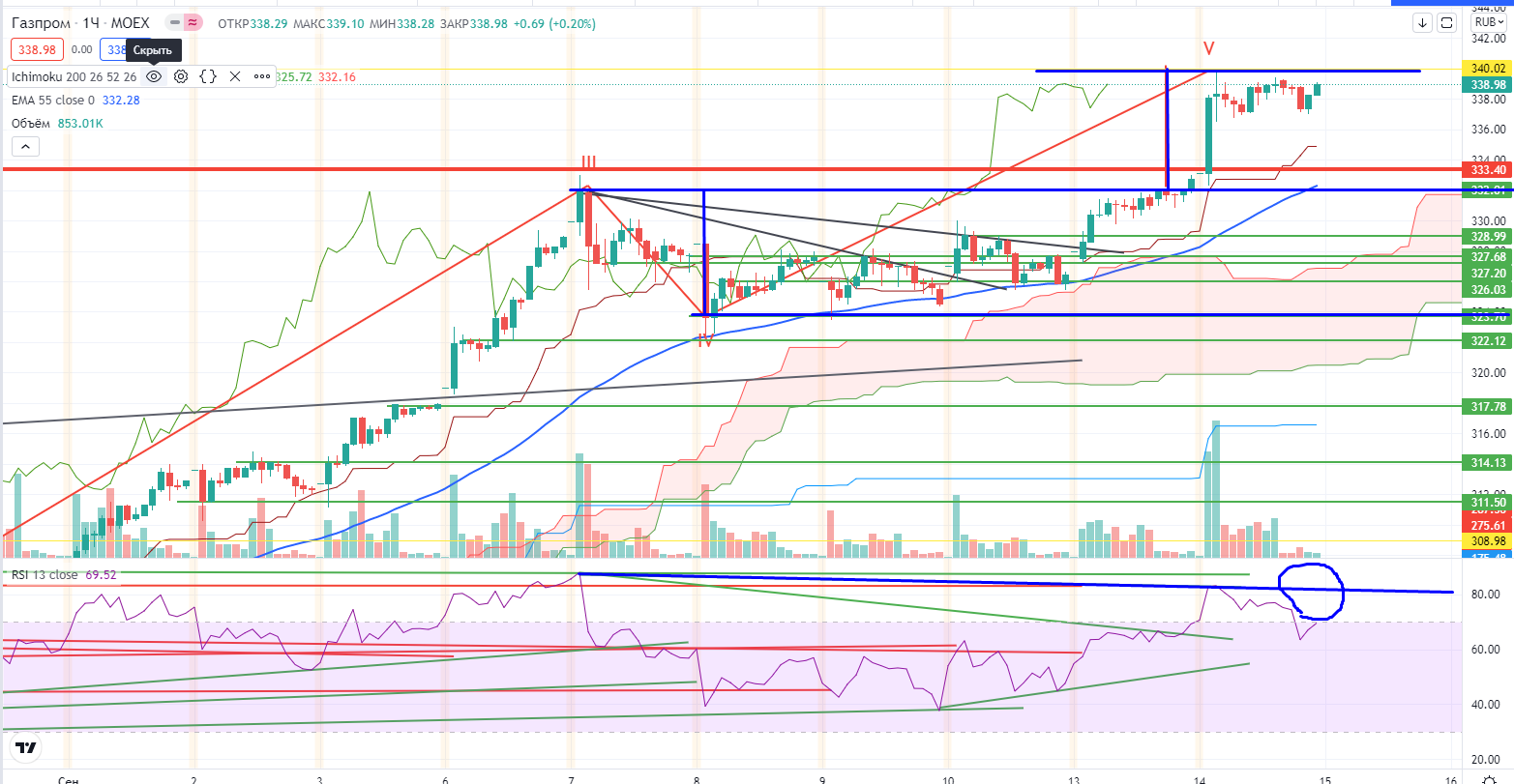 Цитата из поста накануне (https://www.finam.ru/analysis/marketnews/bykam-rasslablyatsya-rano-20210914-09400/). «Газпром на днях похоже начал формирование 5-ой волны вверх, потенциальная дивергенция уже висит, есть целая зона 334,7-365-367,4, с которой цена начала безоткатно падать много лет назад… Если рынок это вспомнит, то хорошо… Шорта пока нет и быть не может, но прикрывать лонги в этой зоне можно!!!» . А в купе с достижением мишени на часах от пробоя канала 340+-, можно прикрывать лонг, от шорта точно нельзя торговать!!!