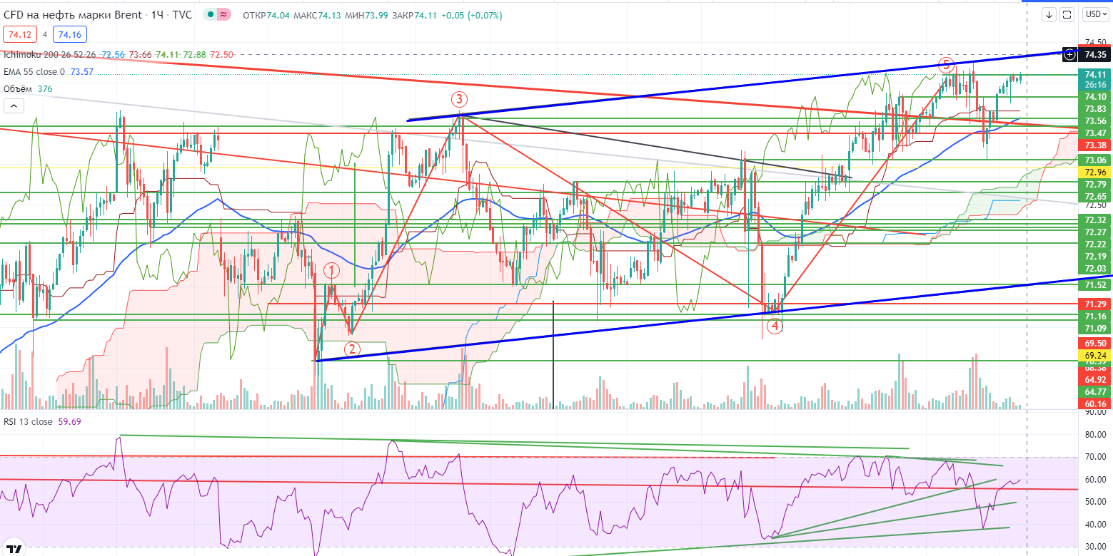 Но коль скоро меня так проверяют нещадно на хаю, в случае удачного разрешения ситуации я не буду рассматривать возможность закрытия шорта (у меня не только шорт на фьючерсе, но еще и купленный пут-опцион BR-10.21 со страйком 74 по 1,67 с экспирацией 16,09 (цена=72,33) (https://www.finam.ru/analysis/marketnews/amerikanskie-indeksy-sobralis-na-korrekciyu-20210913-09400/) ранее нижней границы канала на часах, а это примерно $71,5±, там буду смотреть… Правда на «вечерке» сделал сделку, прикрыл 1/3 шорта по 73,13, продал снова по 73,35 и 73,43, повышаю среднюю продажу.