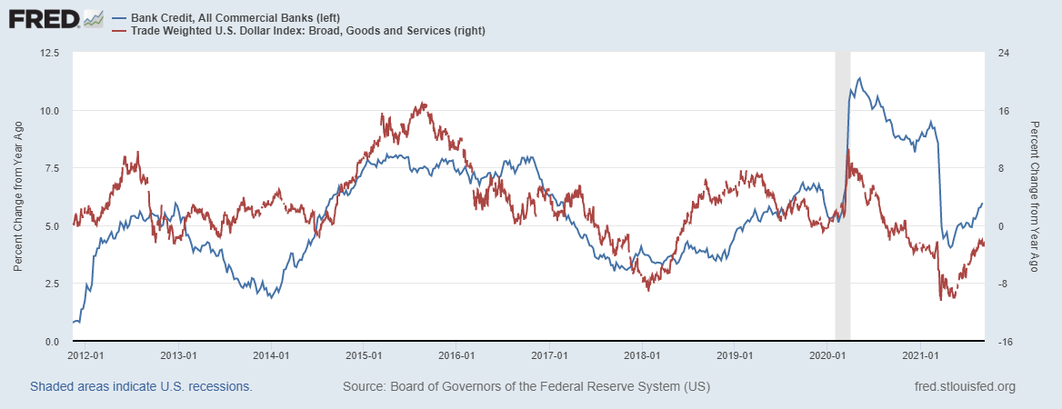 Синяя линия – показатель депозитов в финансовой системе США, в годовой динамике показатель продолжает рост, несмотря на высокую базу прошлого года.