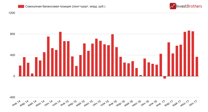Согласно данным Центрального банка, в августе российские кредитные организации снизили вложения в американскую валюту. К началу сентября их совокупная балансовая длинная позиция по доллару опустилась до 370 млрд рублей, что на 484 млрд рублей меньше, чем в июле. Таким образом, банки снизили свои ставки на рост “американца” до минимальных уровней с января 2017 г.