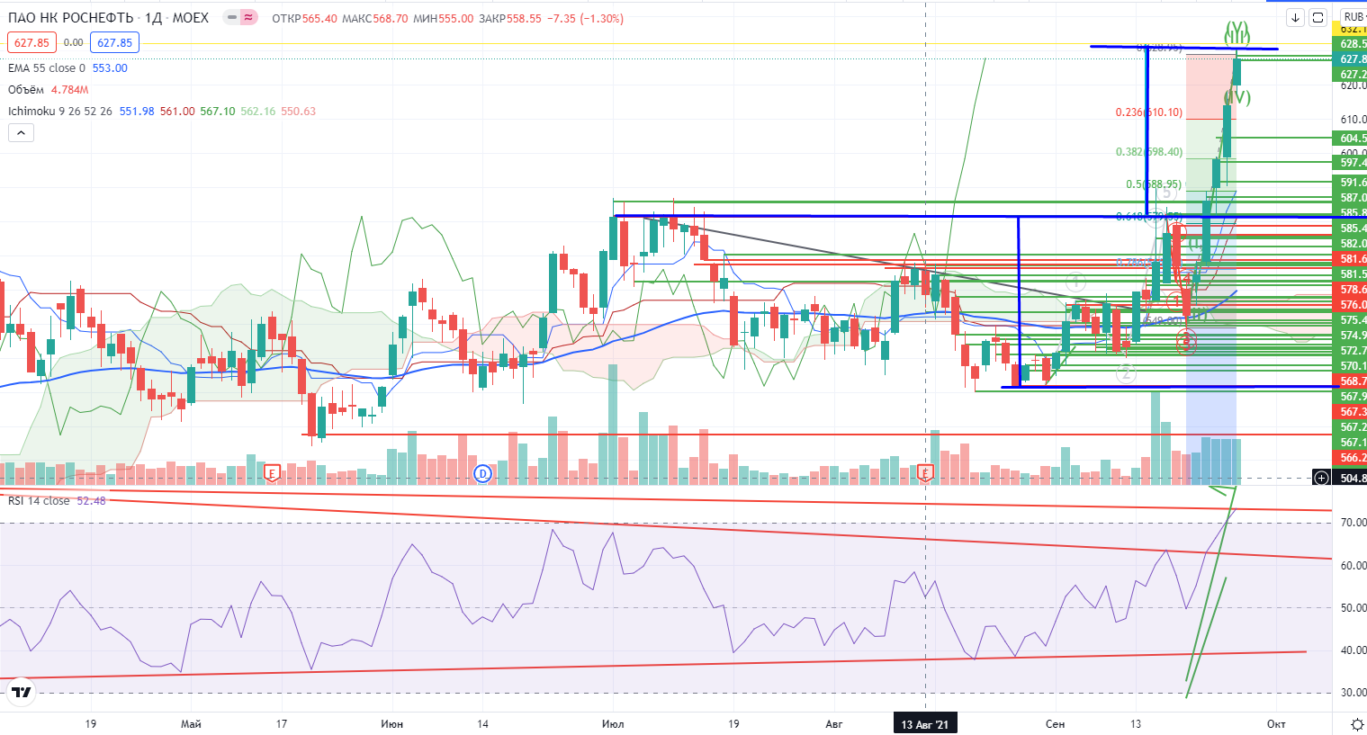 Мишень в Роснефти от пробоя канала 531,7-581,45=631,2± пока не достигнута. Напомню, что в случае нахождения в зоне исторических хаев о сопротивлениях можно только гадать. Это же касается и Газпрома (с пометкой, что это все-таки не исторический хай).
