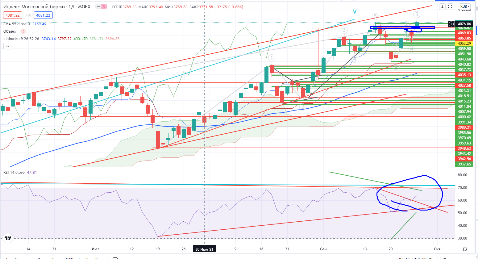 Индекс ММВБ ставит новый исторический хай по закрытиям. Не то, что я против роста, но осторожно надо относиться к лонгам. Имеется потенциальная дивергенция и незакрытый гэп 4055-4069 , который «будет тянуть» вниз…