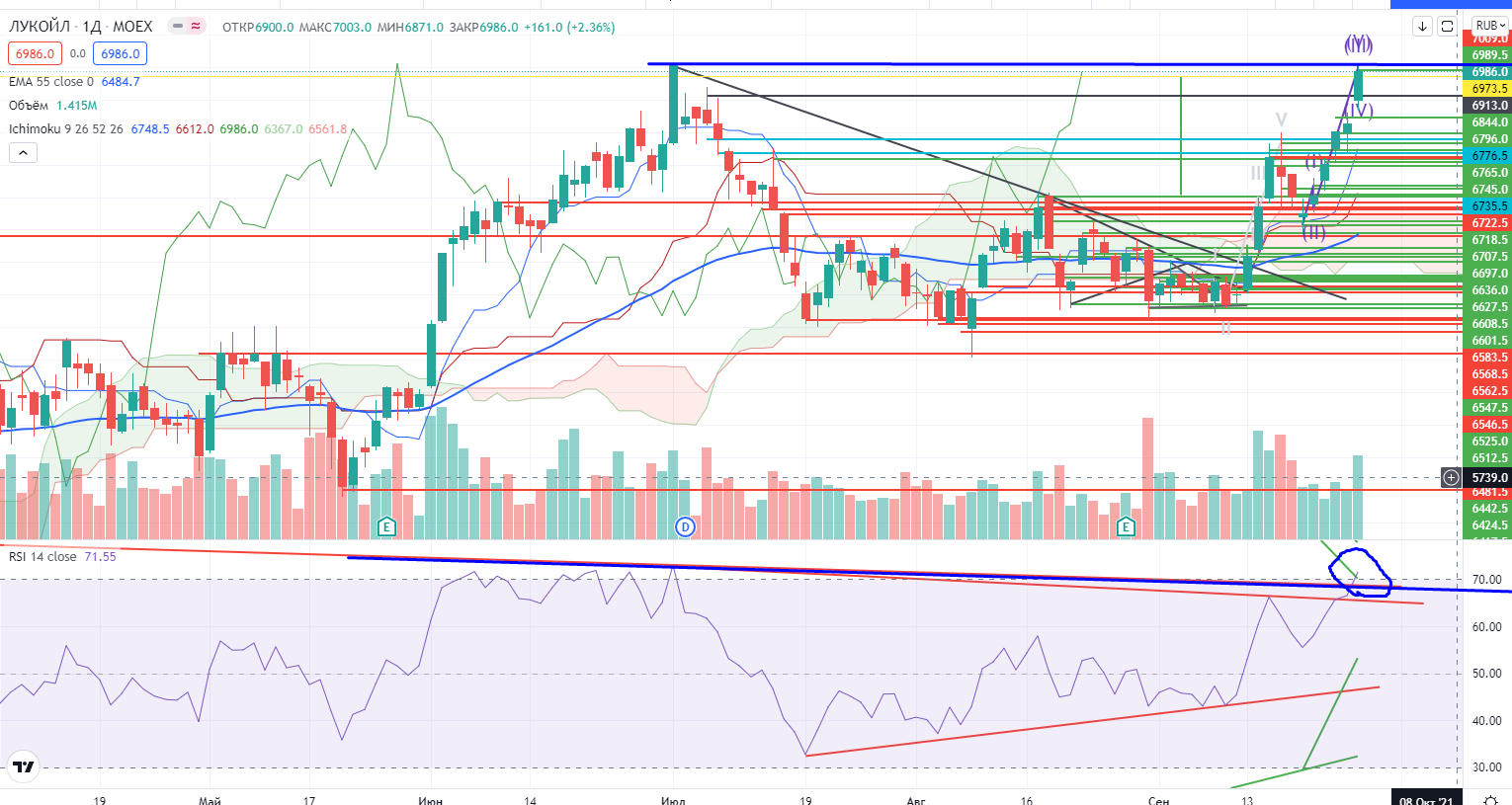 Лукойл на днях под уровнем исторического хая по закрытиям 7010, RSI правда пробивает свой тренд, но это всего-лишь индикатор, цена первична, поэтому рекомендую прикрывать лонг…