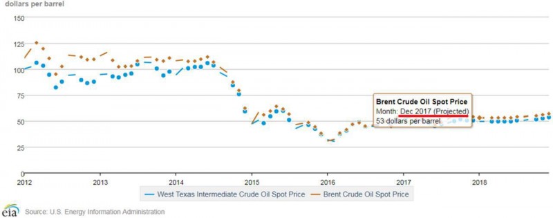 Предыдущий сентябрьский прогноз на декабрь 2017 года: Brent $50; WTI $48. На 2018 год (среднегодовые): Brent $51,58; WTI $49,58