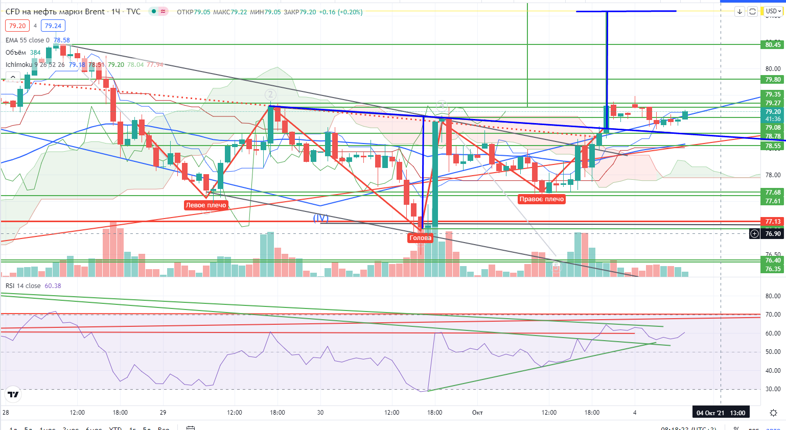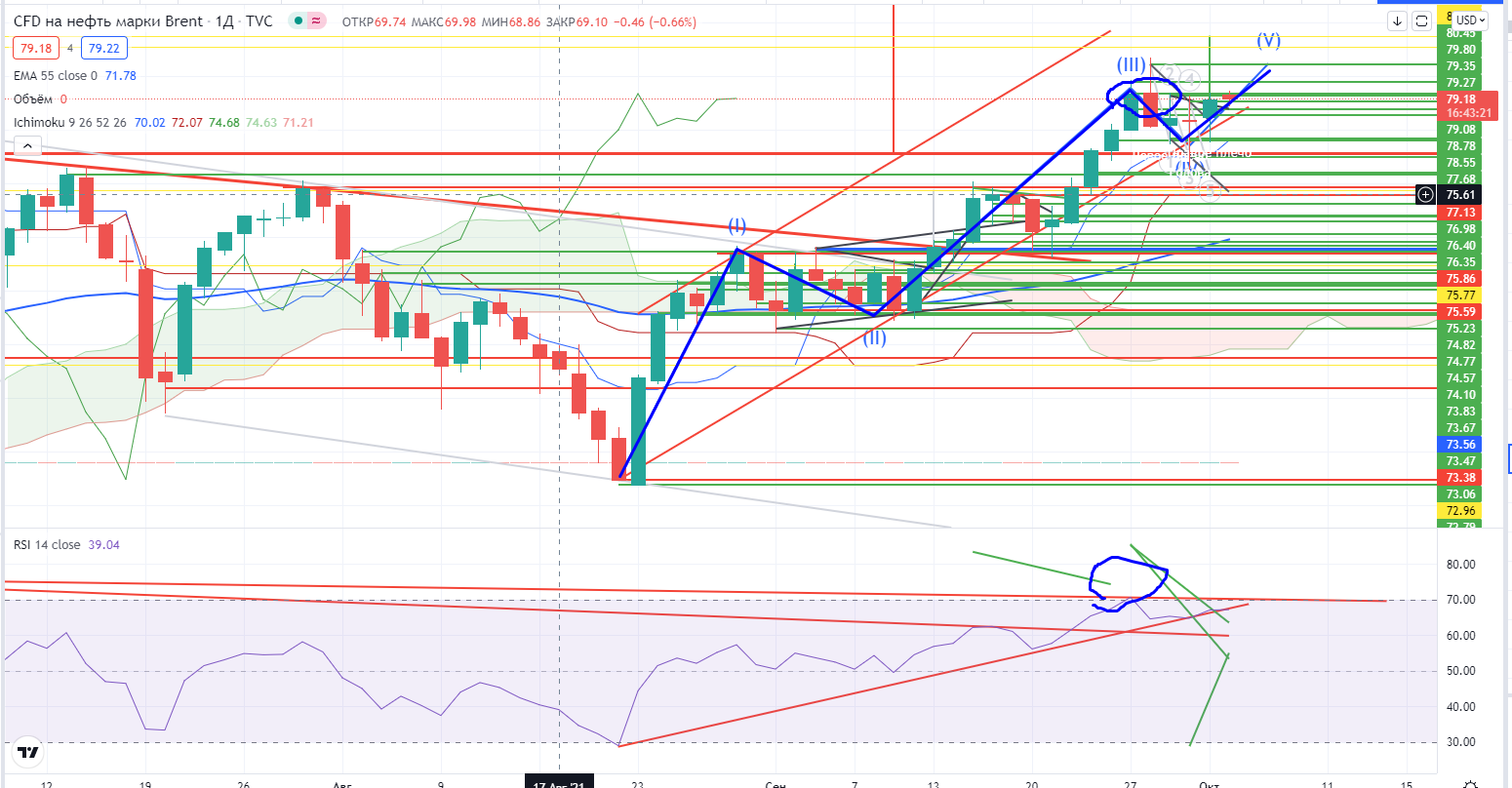 Напомню, согласно моей теории в Нефти на днях была только III-я волна роста (не было дивергенции на крайнем импульсе), а после пробоя линии шеи в нефти на часах в фигуре «Перевернутая Голова и Плечи» все встает на свои места. Мишень от пробоя =81+-, на дневном графике при этой цене может завершится V-я волна роста... Смущает, что пробой случился в пятницу после основного закрытия нашего рынка, но это ведь наш рынок, запад то торговал....Теперь в ней нужно торговать от лонга со стопом под шеей (цена может уменьшаться из-за наклона), мишень укладывается в мое представление на днях!!!