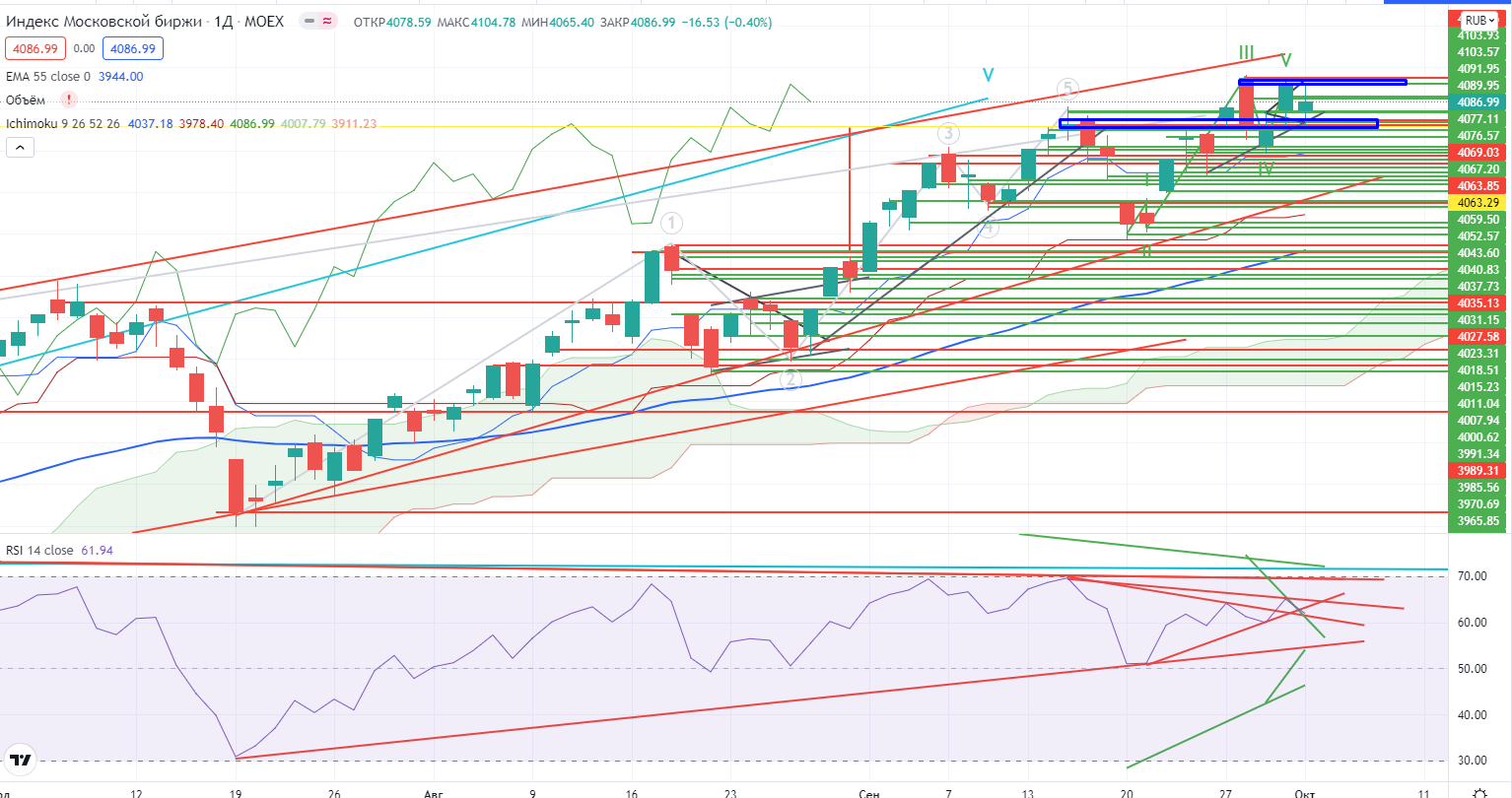 Индекс ММВБ закрылся в пограничной зоне между зоной предыдущего исторического хая 4065-4069 и историческим хаем 4109 (по телу свечи (я шипы не учитываю(!)). Но на часах тройная вершина с дивергенцией.