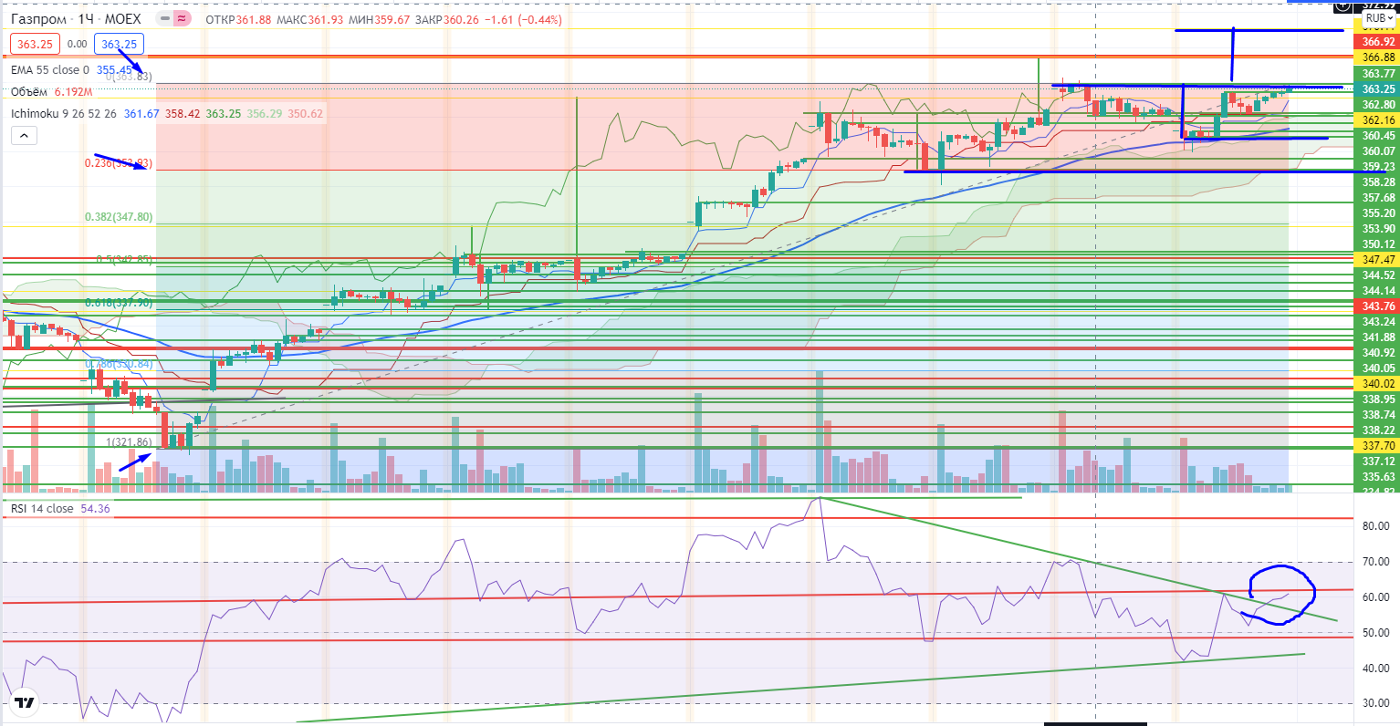 Газпром на днях закрылся очень неплохо для продолжения лонга, В «Газпроме» на часах если провести Фибоначчи, то уровень 364 можно считать за опорным (первая коррекция по Фибо совпадает с поддержкой 354,07). В случае пробития этого уровня новая мишень от пробоя канала 357,61-363,8=370±. От греха подальше закрыл полностью лонг под локальным хаем, но при закрытии часа выше 364+ снова буду покупать.