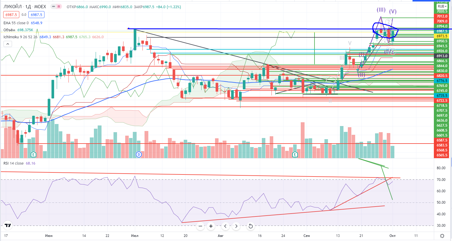 В Лукойле на днях пока не берет уровень исторического хая 7000, на часах же стоп от шорта надо было исполнять, но в лонг можно торговать не ранее (!) пробоя 7023+ на часах!!!