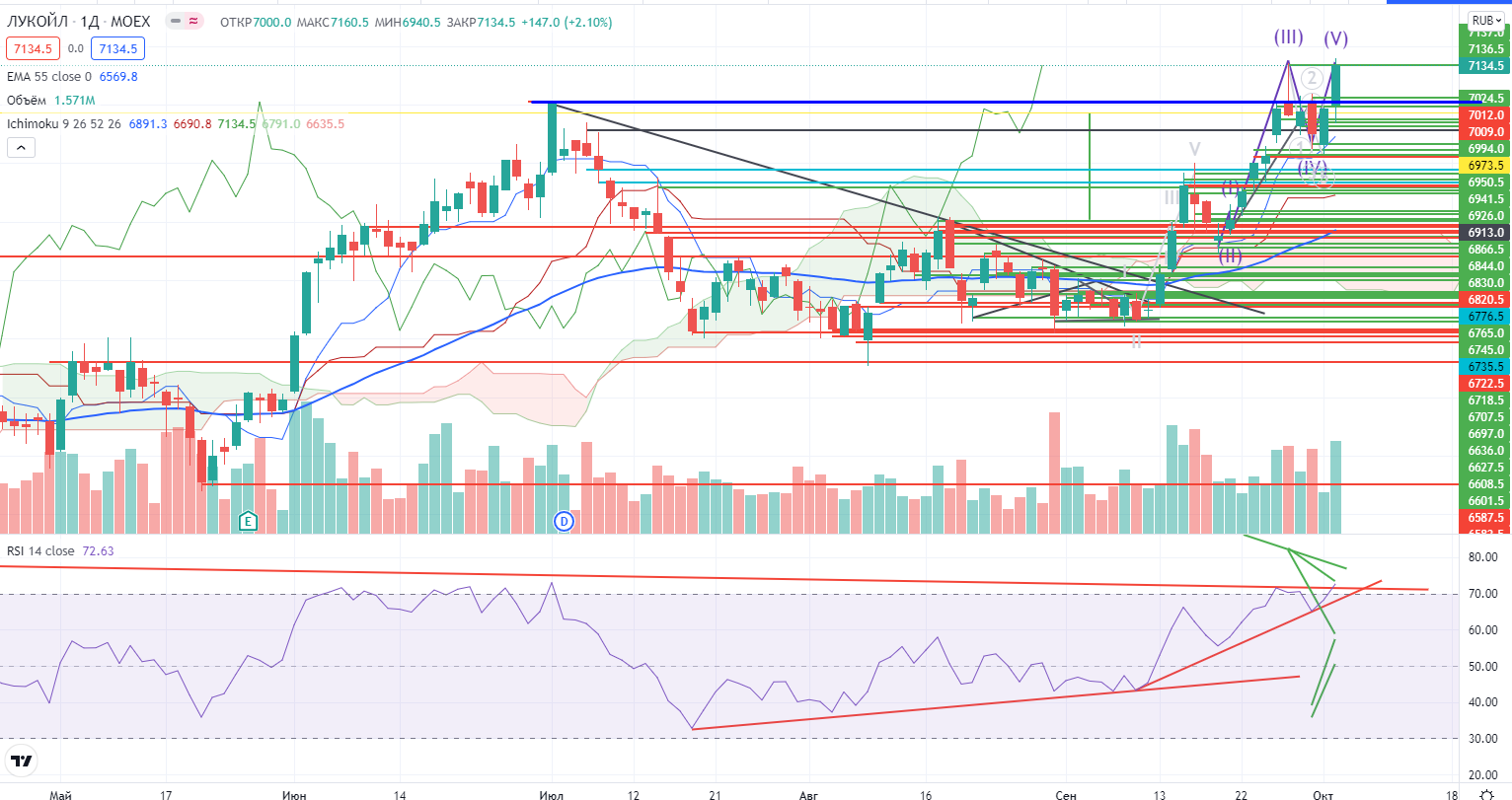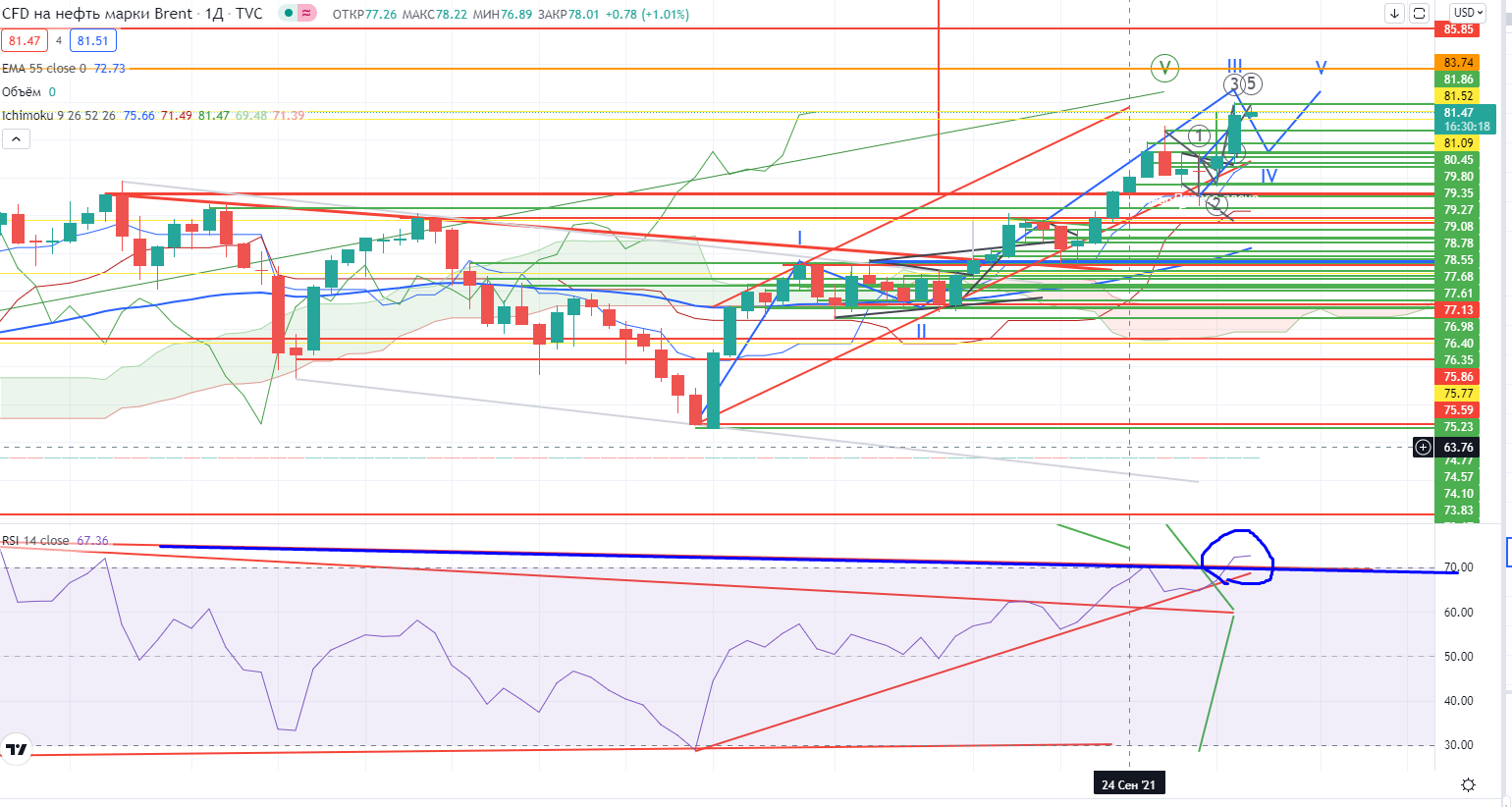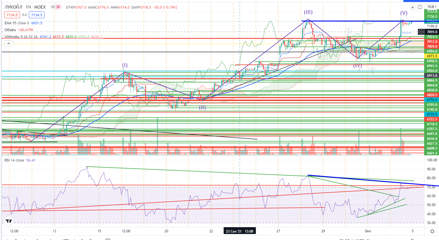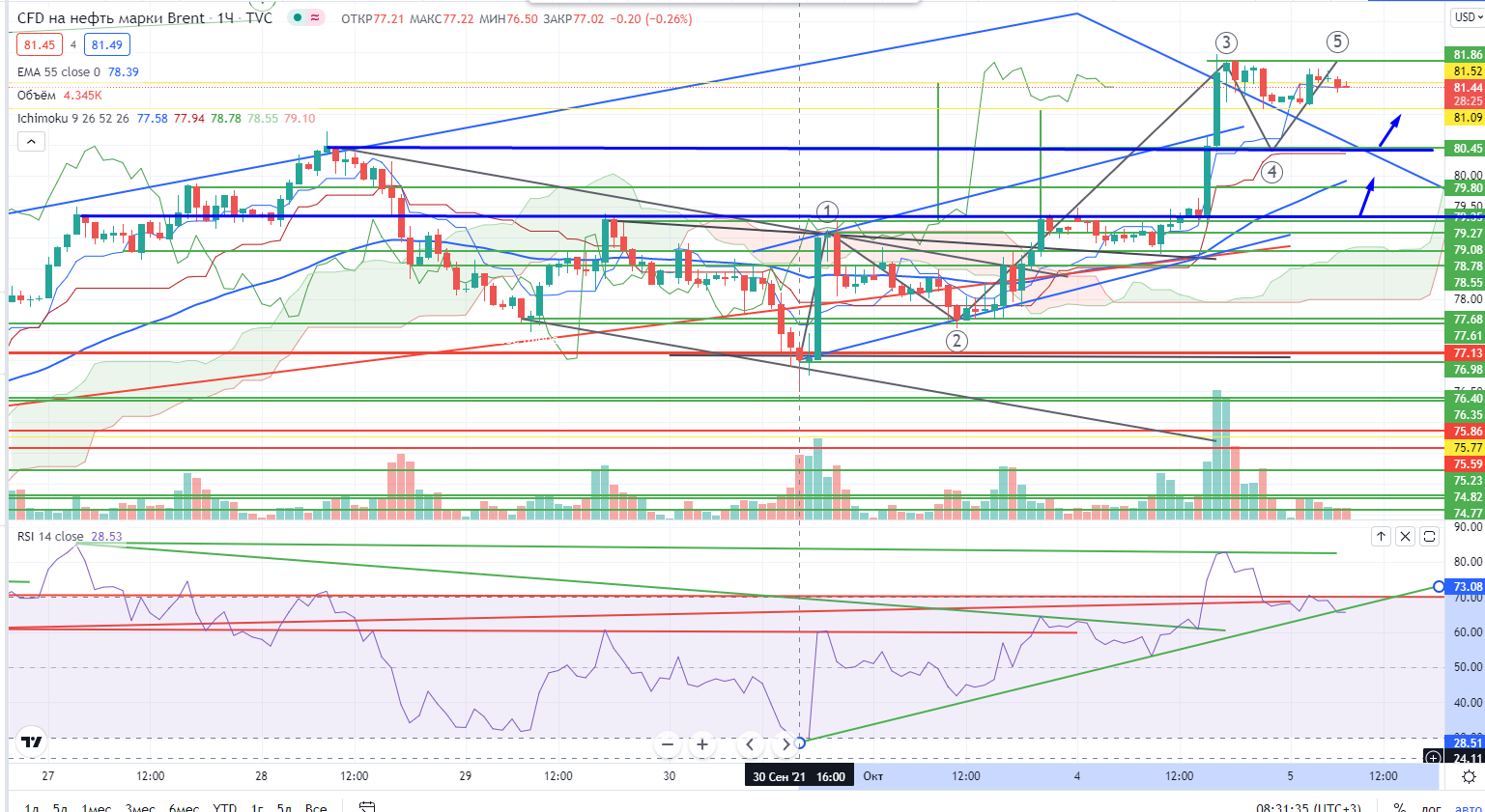 «Напомню, согласно моей теории в нефти на днях была только III-я волна роста (не было дивергенции на крайнем импульсе), а после пробоя линии шеи в нефти на часах в фигуре «Перевернутая Голова и Плечи» все встает на свои места. Мишень от пробоя =81+-, на дневном графике при этой цене может завершится V-я волна роста»-это цитата из моего поста накануне ( https://www.finam.ru/analysis/marketnews/lukoiyl-poka-ne-beret-uroven-istoricheskiiy-xaiy-na-urovne-7000-rubleiy-20211004-09450/). Все именно так и случилось, сначала была проверка шеи и потом пришел выкос, мишень пала уже в середине дня. Я докупил на шее, но закрылся сильно раньше, не дождался ни мишени, ни тем более высоких цен. Но я просто не ожидал, что так скоро реализуется фигура.