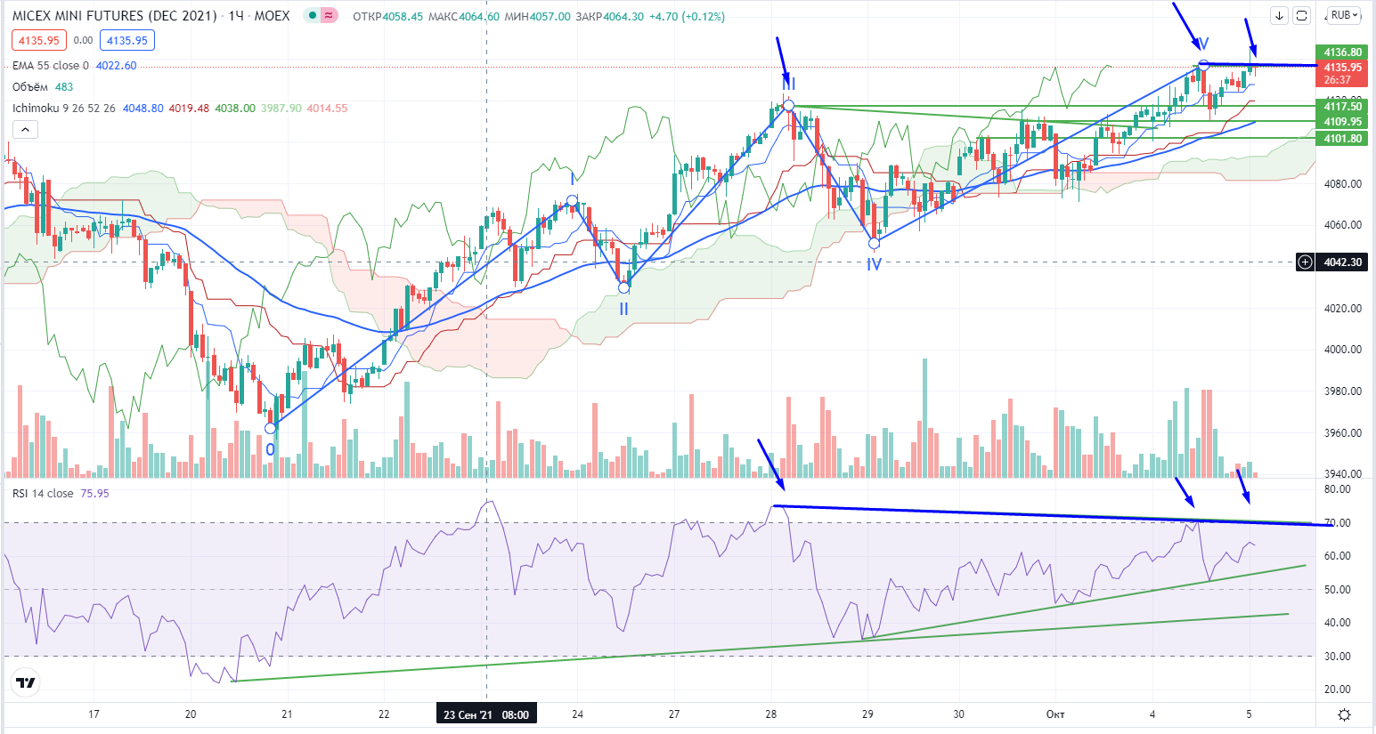 Ситуация по-своему уникальная. Индекс ММВБ обновляет исторический хай на днях, но на часах он находиться в 5-ой волне роста с дивергенцией. На утро еще более видна 5-я волна судя по фьючерсам на индекс ММВБ, возможно лонги сегодня надо прикрывать...