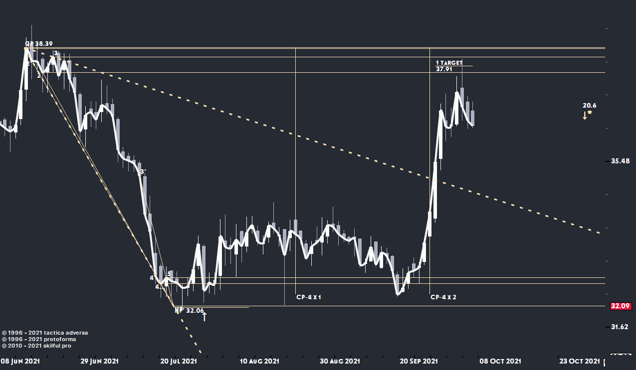 Рассмотрим модель расширения от начала даун тренда на дневном плане по ценам закрытия (уровень НР 32.09, аккурат на поддержке, можно сказать свойство НР: - "быть на грани"):