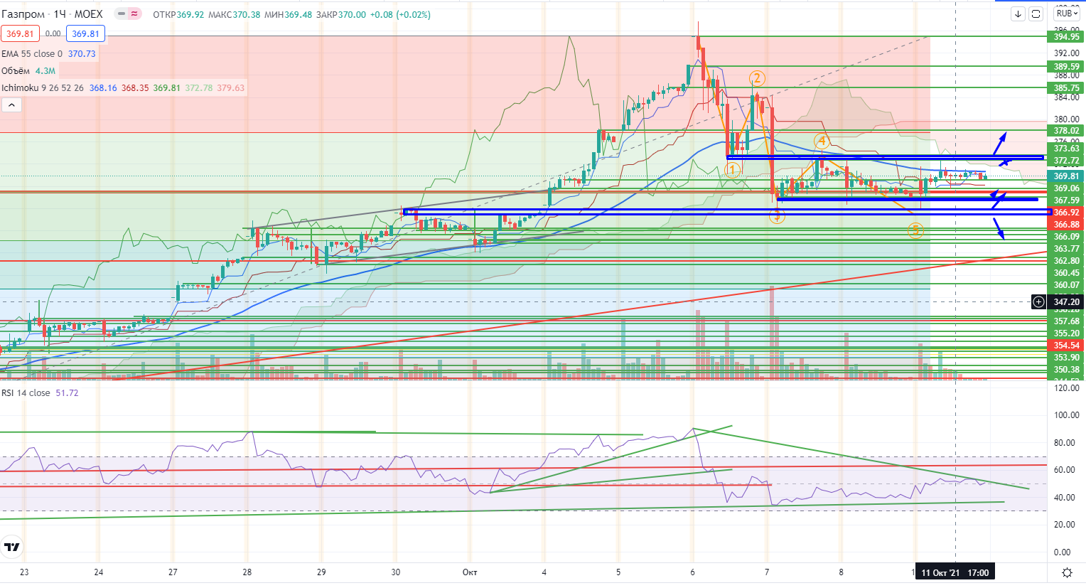 Газпром пока можно держать в лонге, он на днях рисует «типа» доджа, цена над поддержкой, RSI отскакивает от тренда, лонг можно оставлять… Газпром на часах можно пробовать покупать в зоне 362,74-363,8 со стопом 362-, тэйк под 373,5-, можно с переворотом вниз с коротким стопом, при проходе выше можно снова покупать со стопом 373-...