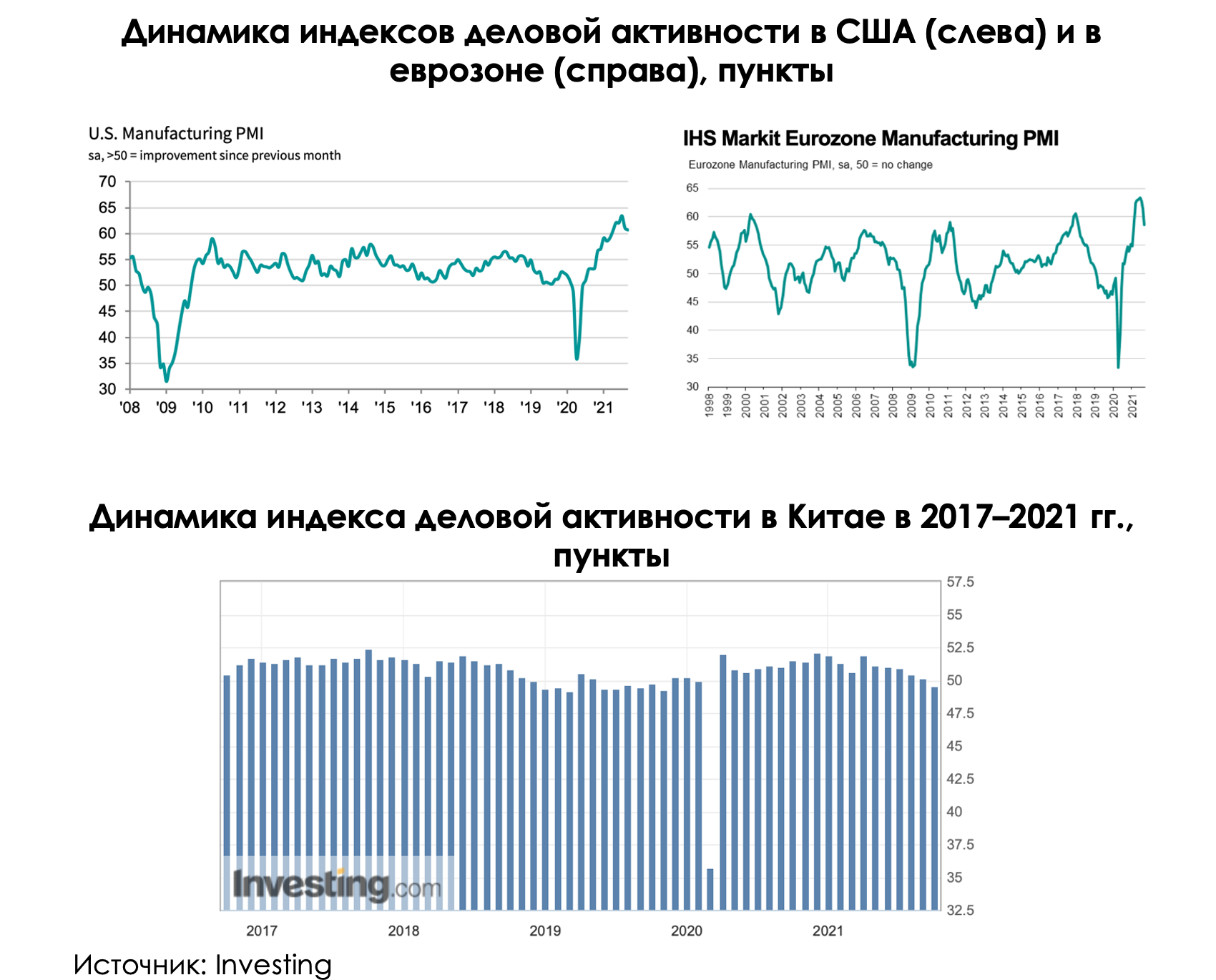 Замедление экономики. Мировая экономика, в том числе экономика США, продолжает замедляться, что мы видим по опережающим индикаторам (PMI) деловой активности в промышленности ЕС, США, и Китае. Замедление экономики может ускориться ввиду давления со стороны энергетического кризиса в ЕС и Китае, что вынуждает останавливать производство до нормализации цен на газ и электричество.