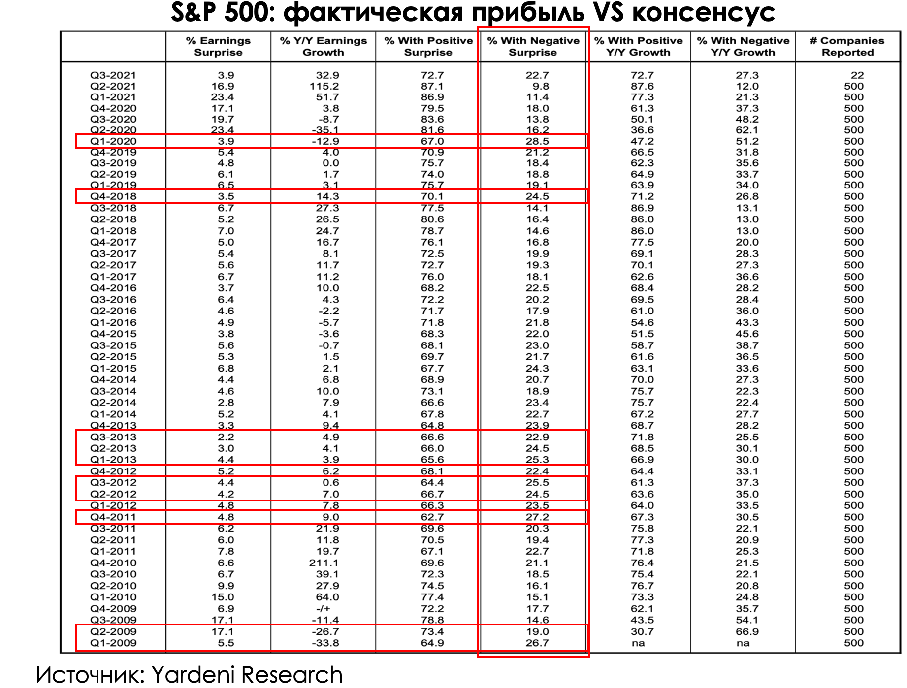 Также выделим периоды, когда был выдающийся процент компаний, который не впечатлил рынок по чистой прибыли. Мы видим, что уже в самом начале сезона отчетности по итогам 3 кв. 2021 года % подобных компаний сильно вырос в сравнении с аналогичным показателем во 2 кв. 2021 года. Так как в среднем отличие от консенсуса составляет около 20%, то выделим все то, что выше и ближе к 25%.
