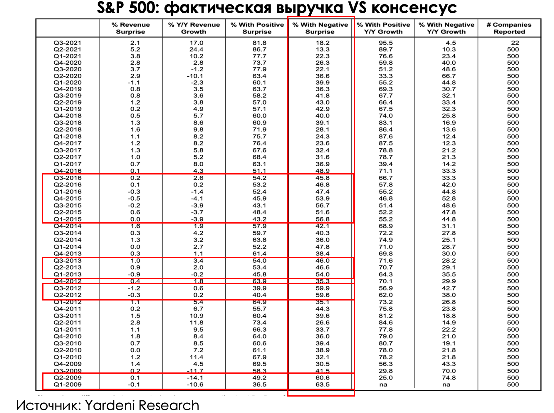 Наш период, который попадает в отбор, — это когда выручка и чистая прибыль сильно негативно удивили рынок. Таких пересечений всего 5: отчеты за 1 кв. 2009, 2 кв. 2009, 2 кв. 2012, 3 кв. 2012, 1 кв. 2013 и 2 кв. 2013. Теперь посмотрим на реакцию рынка. Реакцию рынка стоит рассматривать в следующие 2 месяца после конца календарного сезона, когда наибольший процент компаний из S&P500 уже отчитается. На графике видно, что в периоды общего значимого негативного расхождения выручки и прибыли от консенсуса индекс широкого рынка корректировался только по итогам отчетов за 3 кв. 2012 года или показывал незначительный рост по итогам 2 кв. 2012 года. В свою очередь, в период бурного восстановления рынка в 2009 году индекс показал двузначную доходность, несмотря на высокое негативное расхождение факта выручки и прибыли с консенсусом. Явной негативной реакции рынка не видно.