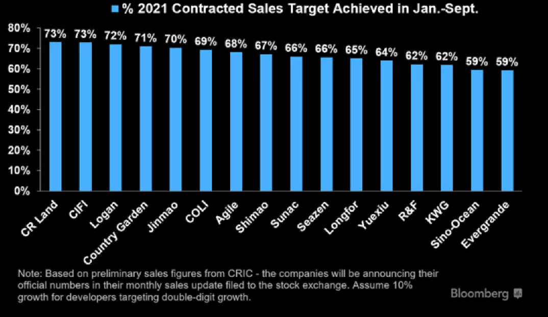 В то время как Evergrande показывает наибольший спад объема продаж среди крупных девелоперов, большинство остальных девелоперов выполняют свои ежегодные таргеты по продажам новых контрактов на жилье.