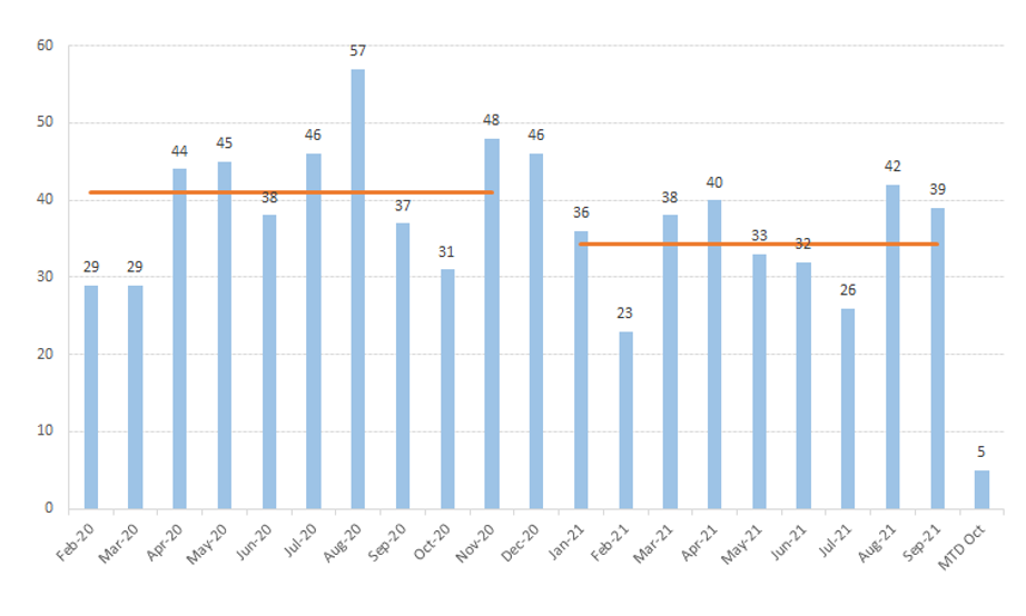 Количество девелоперов, находящихся в тех. дефолте, в сентябре составило 39 компаний, по данным Goldman Sachs. Несмотря на небольшой относительный прирост количества дефолтов г/г, сумма невыплаченных обязательств по облигациям в денежном выражении составила 46,7 млрд юаней, что на 159% больше, чем за весь 2020 год.