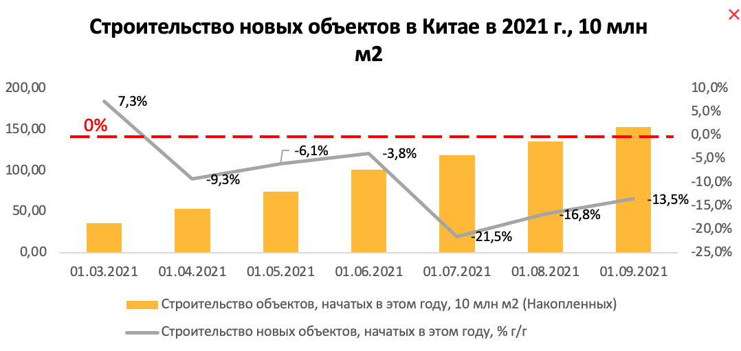 По данным Бюро Национальной Статистики Китая, строительство новых объектов снизилось на 13,4% г/г, что является продолжением нисходящего тренда ввода новых строительных объектов из-за долгового кризиса сектора недвижимости.