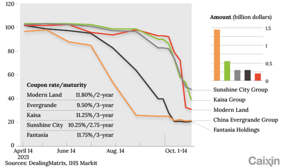 Помимо нашумевшей компании Evergrande под риском дефолта также находятся другие известные девелоперы, и рынок это отражает в ценах на долговые инструменты. Несмотря на небольшой размер этих компаний по выручке, кроме Evergrande, (к примеру, Fantasia Holdingsзанимает 64 место в индустрии), рынок прогнозирует еще больше дефолтов.