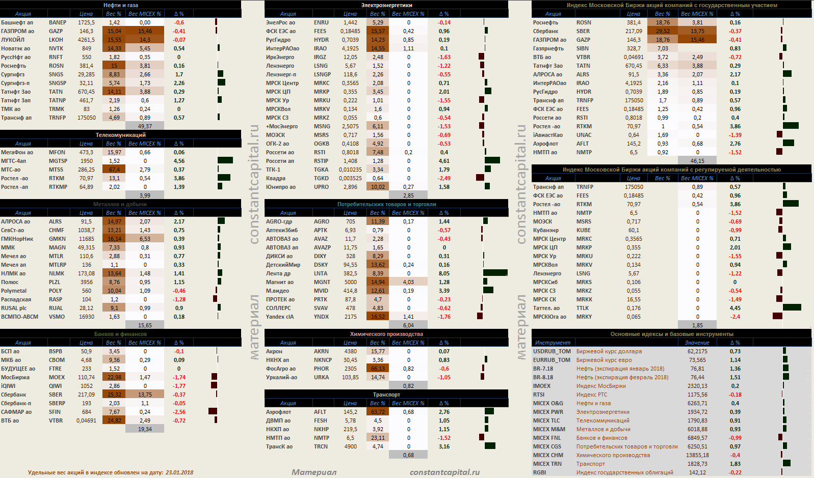 Динамика акций за текущий день, в структуре отраслевых индексов, и индексов государственного сектора.