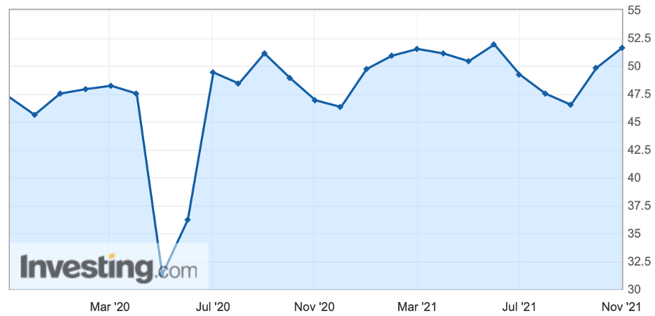 Промышленный PMI в октябре продолжил рост со значений сентября и достиг 51,6 (пред. 49,8) на фоне возобновившегося роста производства и клиентского спроса за последние несколько месяцев. Индекс свидетельствует об улучшении деловой активности, показав первое положительное значение с июня.