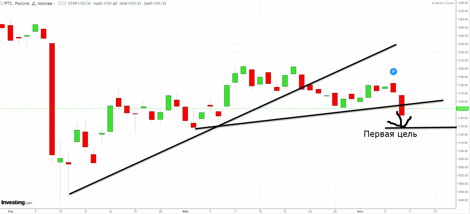 В моём прошлом посте по индексу ртс в конце мая я писал, что он упал на восходящий тренд, но цели по движению лежат ниже. С 28 мая индекс ртс отскочил от своего тренда, но совершив отскок за последние пару дней индекс всё таки вышел на тренд и пробил его как и предполагалось.