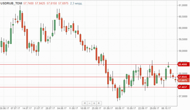 Рубль/$ в четверг продолжил консолидироваться вблизи отметки 57,85, в рамках диапазона 57,40-58,40, определяясь с направлением движения.