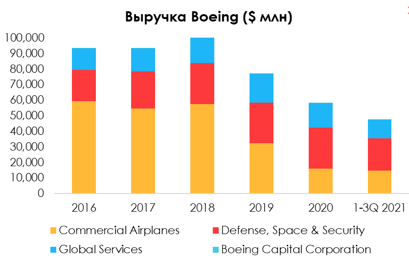 Продажа коммерческих самолетов и оборонный сектор традиционно являются самыми большими источниками выручки для компании. Однако в связи с пандемией, а также с техническими проблемами, обнаруженными в 2019-2020 гг. в двух самых популярных моделях коммерческих самолетов компании — самолетах 737 и 787 — Boeing столкнулся со значительным снижением выручки в коммерческом секторе при том, что значения выручки в остальных сегментах остаются достаточно стабильными.