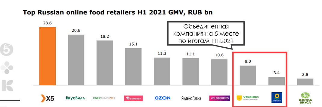 Лента рассчитывает, что приобретение Утконоса позволит ей существенно увеличить свою долю на онлайн-рынке за счет интеграции дополнительной платформы по доставке продуктов, обладающей лояльной базой покупателей, уникальными компетенциями и конкурентными преимуществами. Все так, доля Ленты на рынке, действительно, увеличится (по итогам 1П 2021 г. Лента на 9 месте, вместе с Утконосом на 5), но именно вернуть лидерские позиции или хотя бы удержать долю будет уже труднее, так как другие крупные игроки агрессивно инвестируют в рост.