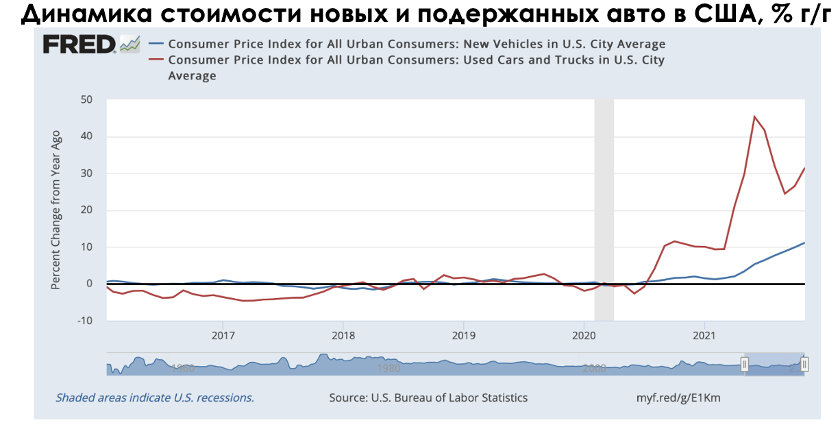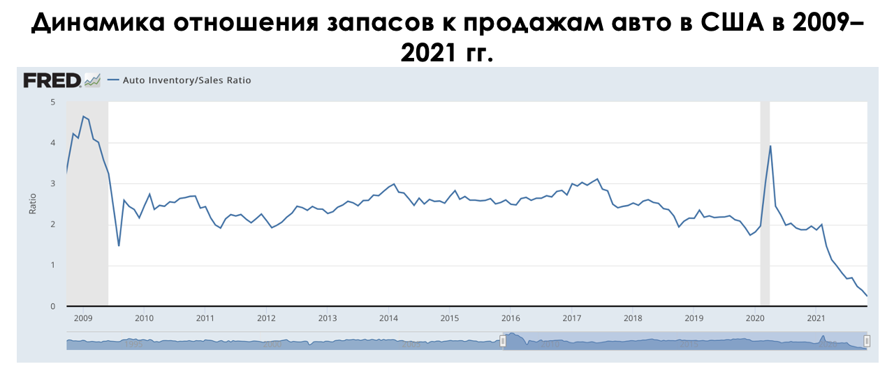 В период резкого восстановления спроса на потребительские товары и автомобили ввиду постепенного снятия карантинных ограничений и реализации эффекта отложенного спроса оказалось, что для производства новых чипов просто нет мощностей. Иными словами, довольно быстрый сдвиг в балансе спроса и предложения привел к тому, что автопроизводители и производители потреб. товаров вынуждены снижать производство своей продукции и довольствоваться крохами. В связи с этим запасы новых авто падают, а покупатели переключаются на подержанные автомобили.
