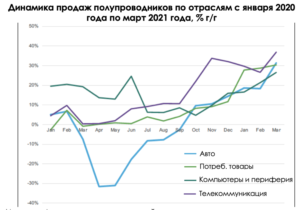 В пик карантинных ограничений резко выпал спрос на полупроводники со стороны автопроизводителей и потребительских товаров, который был, по сути, частично замещен безумным ростом со стороны производства компьютерной периферии для удаленной работы, медицинских устройств (например, увеличение производства систем искусственной вентиляции легких), а также спроса со стороны телекоммуникационного сектора.